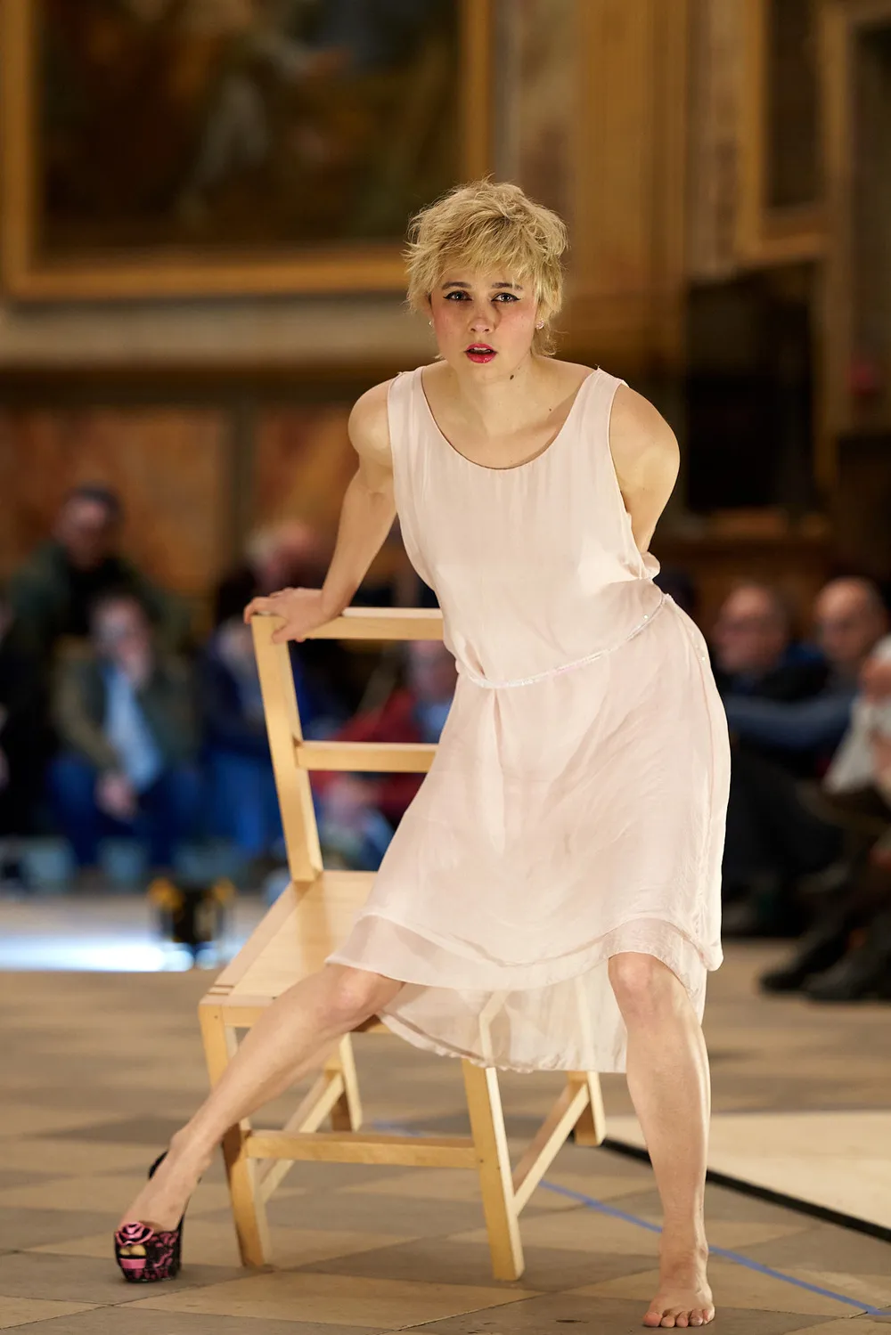Assise face au public, perchée sur une chaise dont deux pieds restent suspendus dans les airs pendant toute la performance, l’artiste incarne une figure féminine à l’équilibre toujours menacé, sans jamais tomber. Elle porte un maquillage volontairement exagéré, inspiré des E-girls, et adopte au départ une posture impeccable, presque stéréotypée — celle d’une “good girl”.
